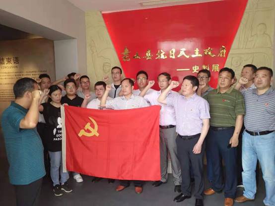 在紀念館史料展廳背景前,面對鮮紅的中國共產(chǎn)黨黨旗,全體黨員莊嚴地舉起右手,握緊拳頭,集體宣讀入黨誓詞,重溫入黨時的莊嚴承諾和堅定決心。